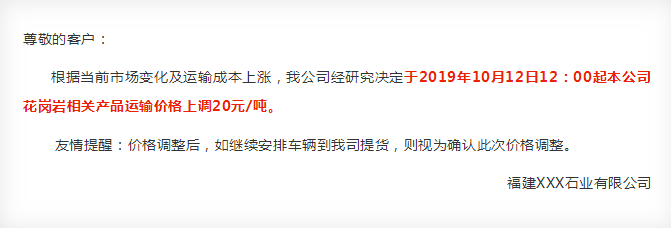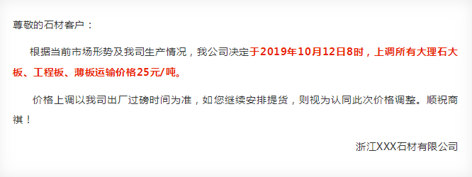这也使石材企业、钢铁企业,水泥企业,砂石企业,物流企业等在内的涉及大宗物流陆路运输的企业纷纷发布执行标载,超载不予装卸以及涨价通知。有企业公布花岗岩相关产品运输价格上调20元/吨。有企业则上调所有大理石大板、工程板、薄板运输价格25元/吨。