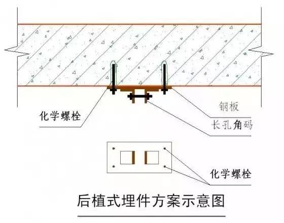 后植式埋件方案,要求钢板和角码先在工厂焊接加工,整体热镀锌完成后,进行现场安装。