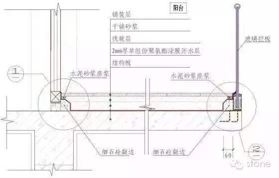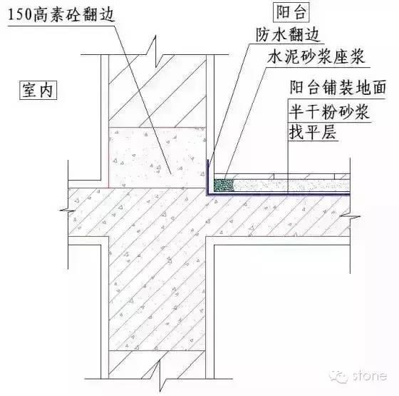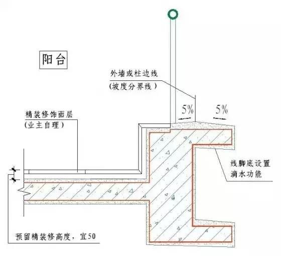 1.阳台上翻梁与外线条分别设内外排水坡;