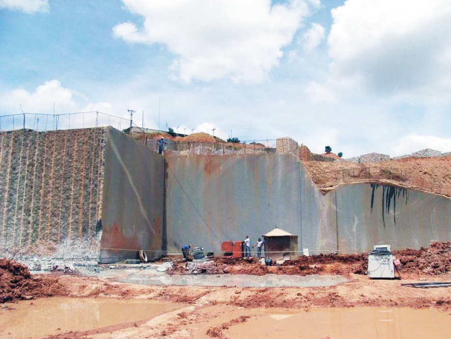 首先,可完成山坡露天硬质石材矿山从矿体分离长条块石作业。在有三个自由面的山坡露天硬质石材矿山,串珠锯和凿岩机负责切割或钻凿排孔分离长条块石。