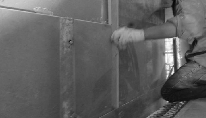在下面已经固定的石材上口或石材侧边抹云石胶,进行快速固定上部新安装的石材(图2)。石材安装初步就位以后,检查平整度(图3)。