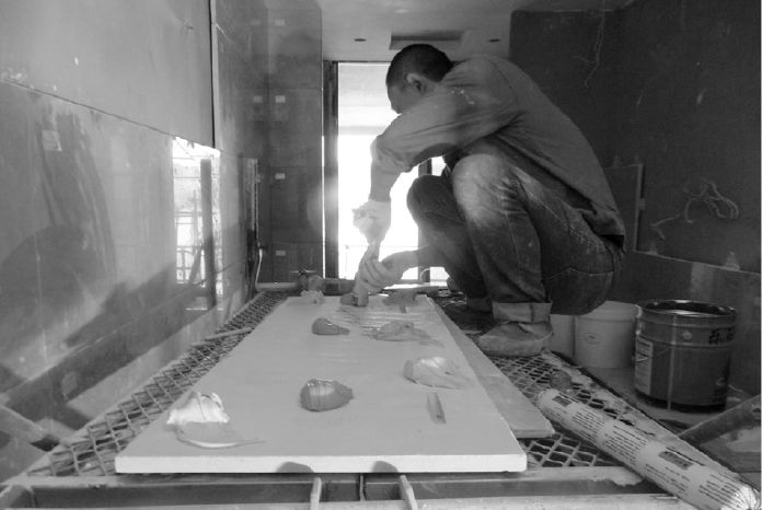 (2)用云石胶加入适量快干剂拌合以后,用来快速定位及填补石材缝隙,把此胶少许抹在墙面已经安装固定石材的上口或侧边处,用于固定新安装的墙面石材。